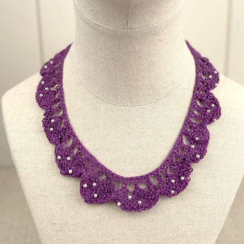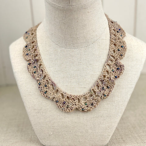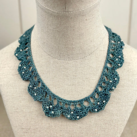 A beautifully delicate scalloped Necklace Knitting Kit using our own hand dyed Tussah Silk lace weight yarn coupled with lovely pearl beads which are knitted into the fabric. The necklace fastens at the back with a neat magnetic clasp.