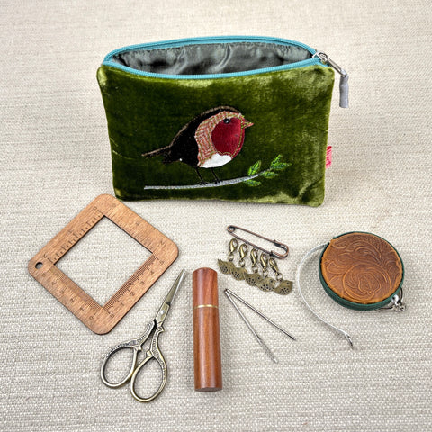 The eye catching Accessory Purse (a lovely gift on it's own) is beautifully made with a velour front featuring an applique Robin and woven herringbone back. It has a coordinated satin lining and closes at the top with a matching zip fastener.