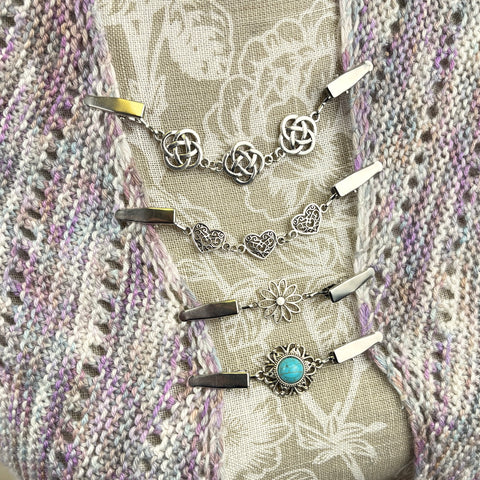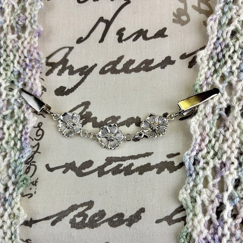 These versatile and attractive metal Shawl Clips feature a tasteful design consisting of linked charms in various designs and metal types and are a perfect adornment for any knitted or woven shawl, wrap, scarf, open cardigan or coat.