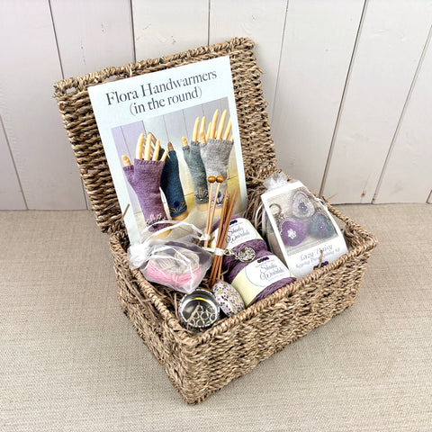 Neatly presented in the smart Seagrass Hamper are Flora Handwarmers Knitting Kit (choice of 6 colour combinations), Lazy Daisy Keyring Purse Knitting Kit and a Floral Design Tin containing ring stitch markers. There is also the option to have the handwarmers kit as Knit Flat or Knit in the Round (please choose from the drop down menu) and the appropriate knitting needles will be included.